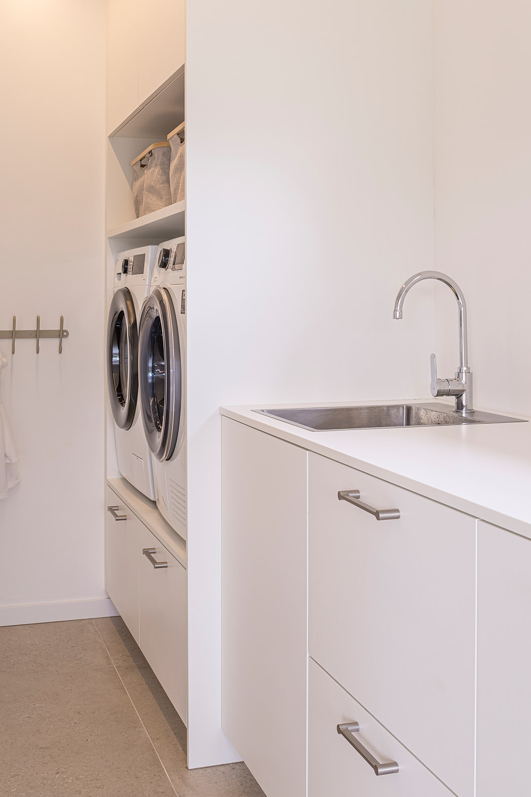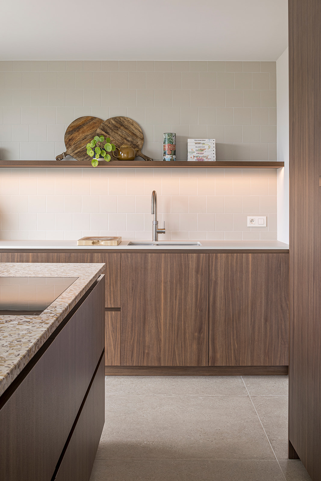 Omdat we tijdens de renovatie in de woning zijn blijven wonen, kozen we bewust voor een gefaseerde aanpak. De woning werd volledig gestript, maar de werken werden zorgvuldig ingepland zodat we als gezin altijd een leefbare ruimte hadden.